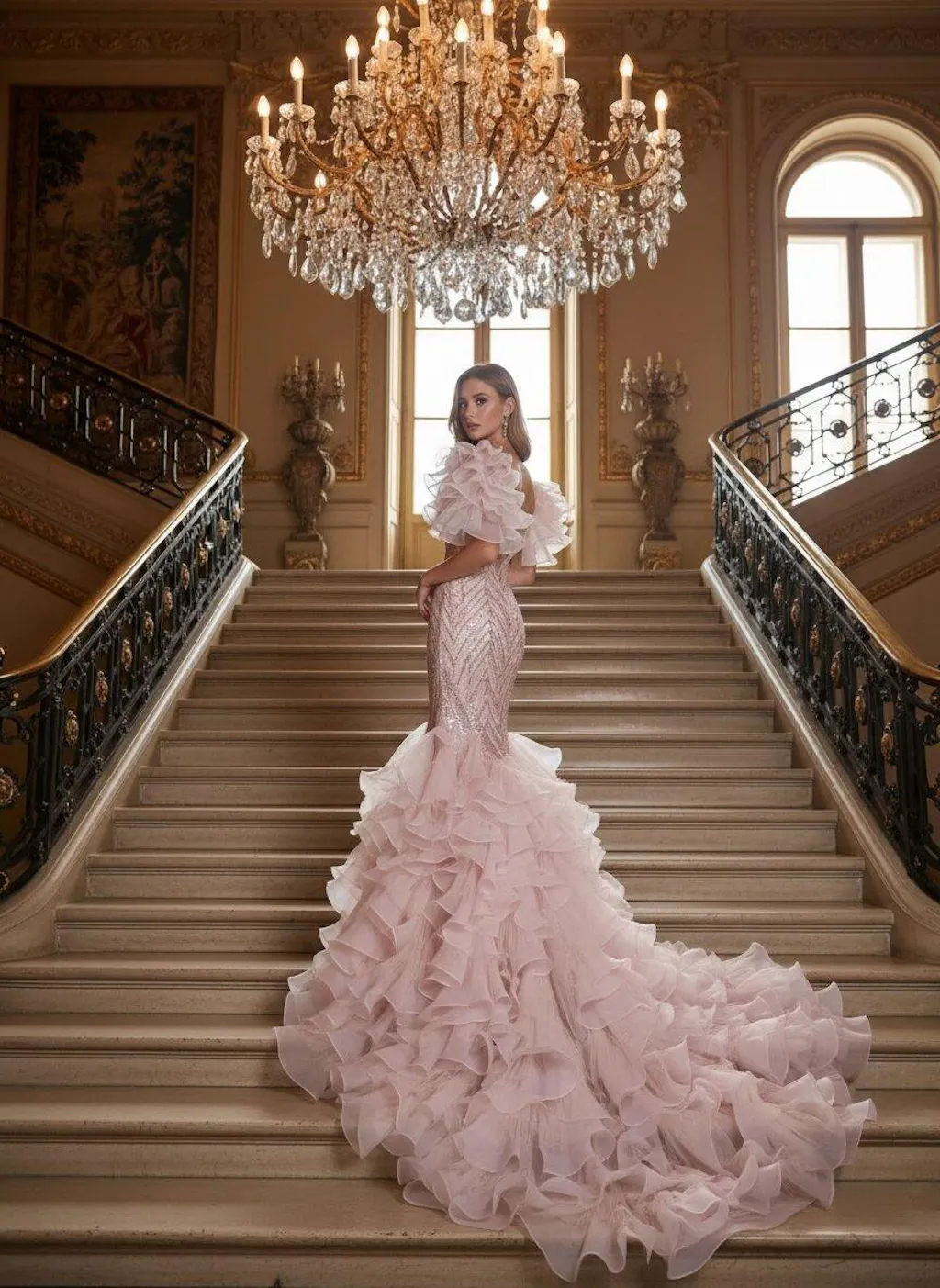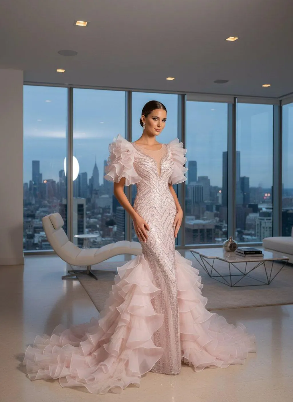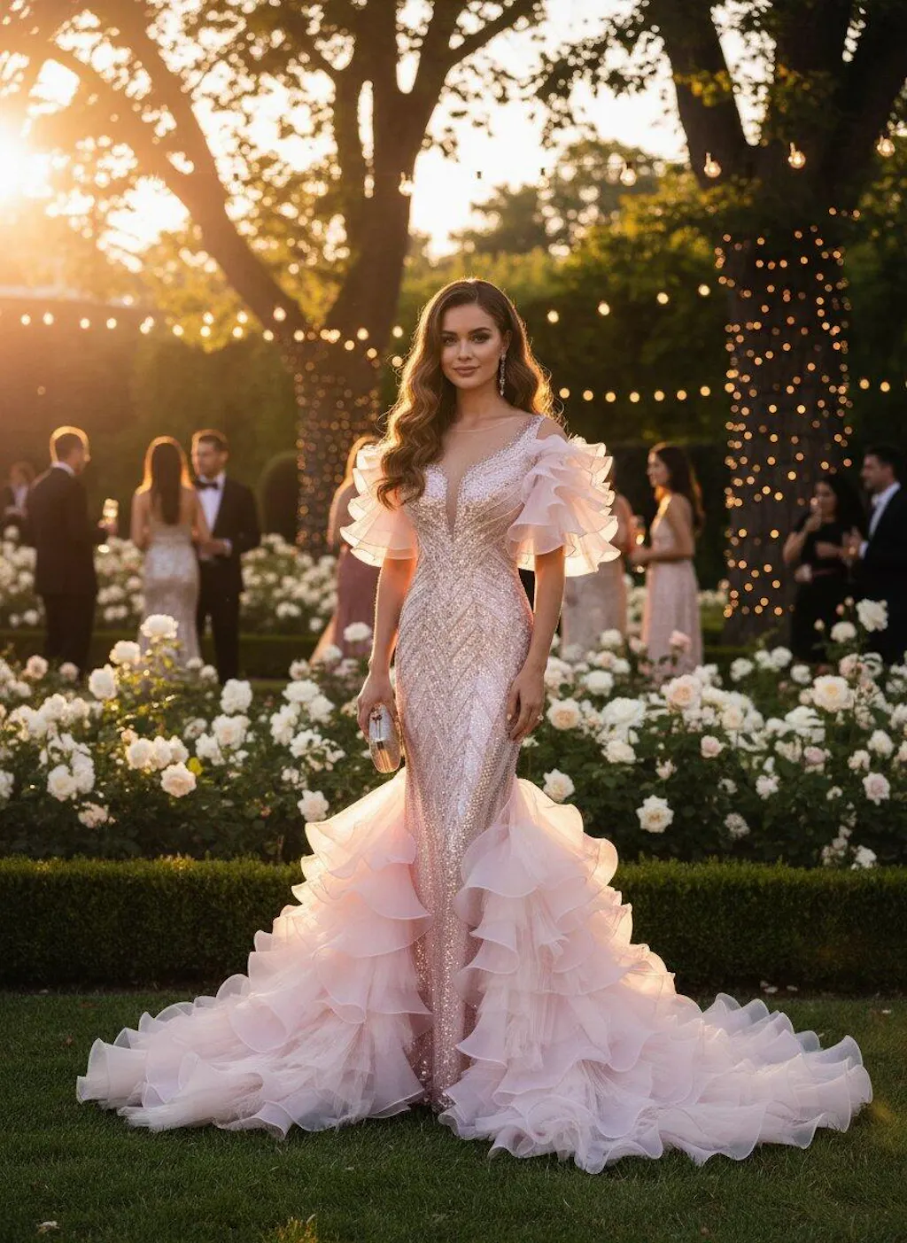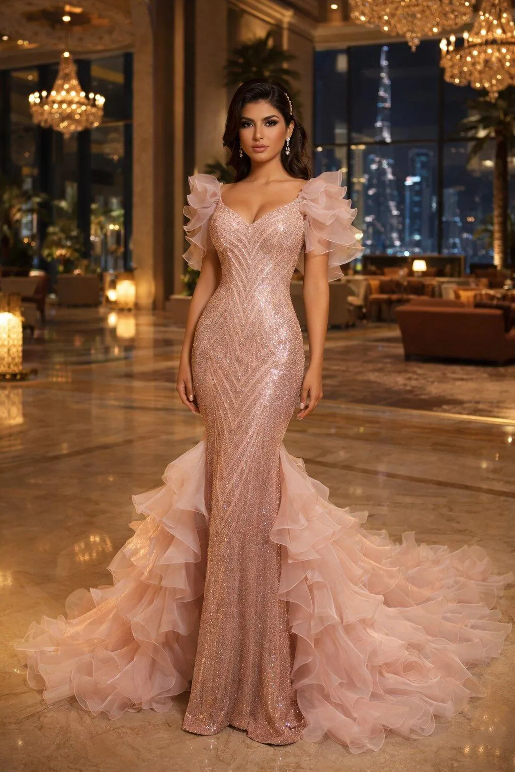 At a spring garden gala where roses climb ancient stone walls: the blush tones harmonize with blooms at their peak. During an evening wedding procession as petals rain upon cobblestones: the geometric sequins catch each flicker of lantern light like scattered stars. For a family feast as summer twilight deepens: the detachable wrap allows grace to shift with the hour. At an intimate couture presentation in a salon filled with gardenias: the ruffled sleeves drift among guests like whispered secrets. At a charity dinner overlooking terraced hills at golden hour: the gown's quiet craftsmanship speaks of traditions that ask nothing but to be continued—each sequin a reminder that beauty, like essence, is most precious when distilled with patience and care.